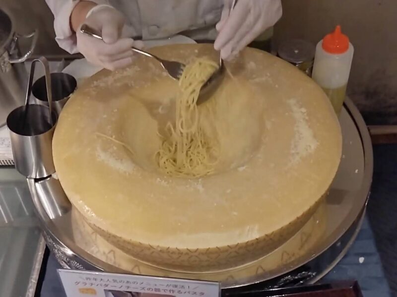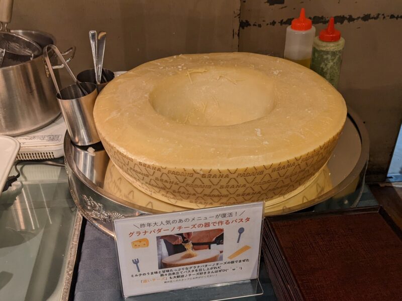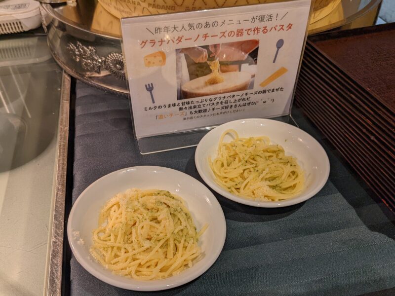 ミルクのうま味と甘味たっぷりなグラナパダーノチーズの器で実演のパスタ。チーズ好きには嬉しいメニューです。