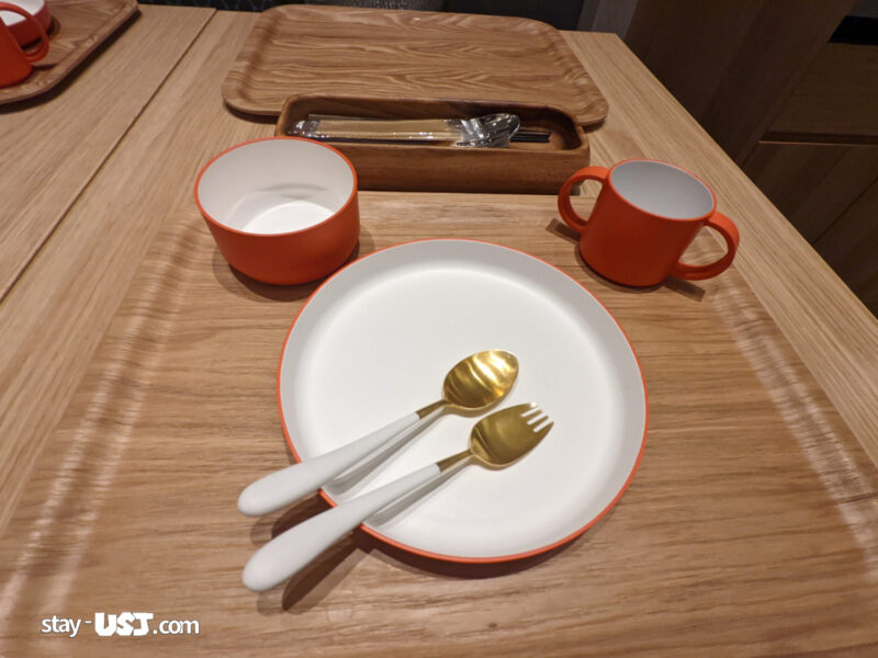 子供用のお皿やボール、コップ、カトラリーがあります。食器類のブランドはtak。見た目に統一感がありますね。