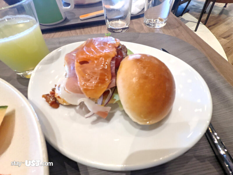 ハンバーガーのソースにはケチャップやチーズソースがあります。更に…生ハムやスモークサーモン、チーズなどをセルフトッピングできます!朝から贅沢~♡