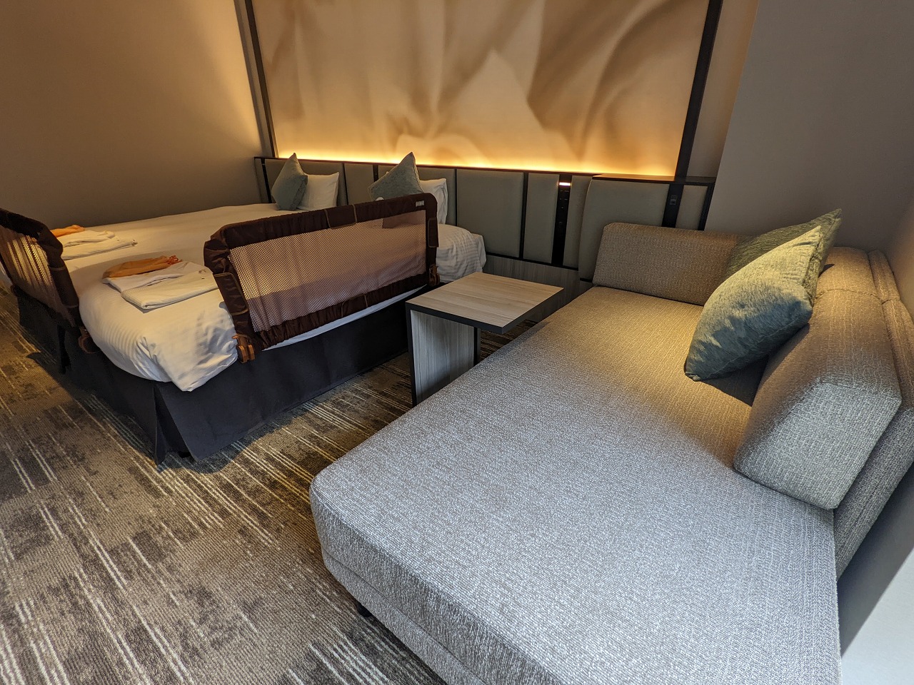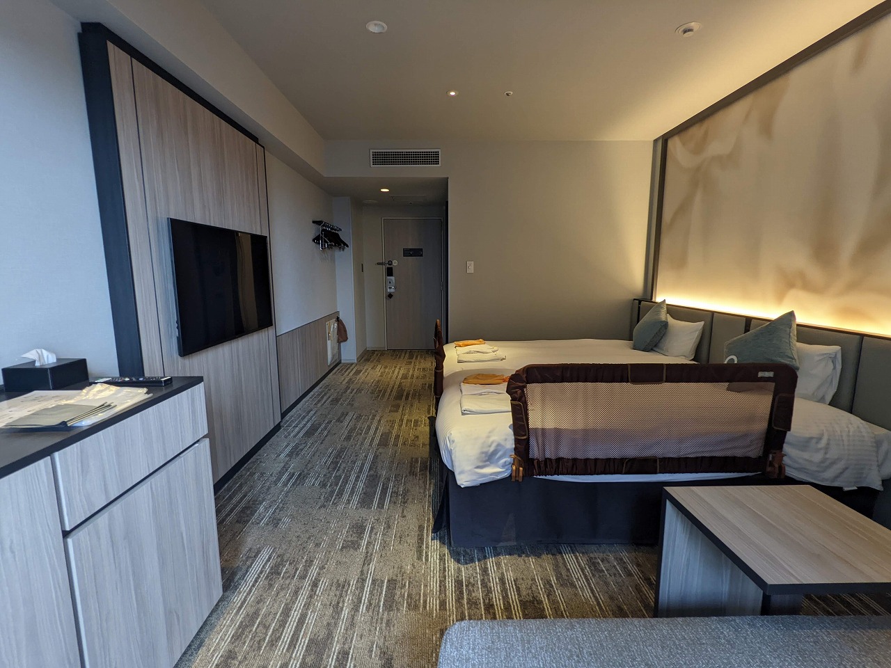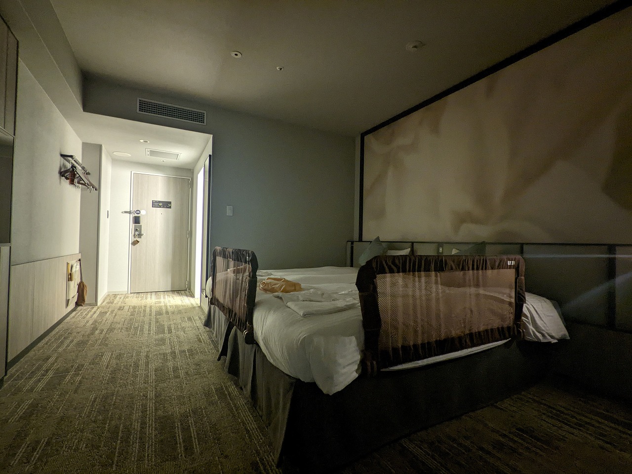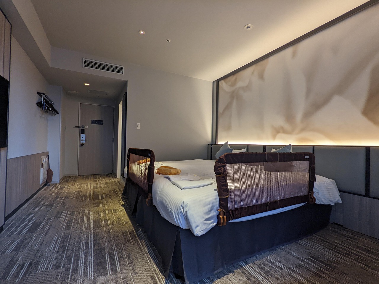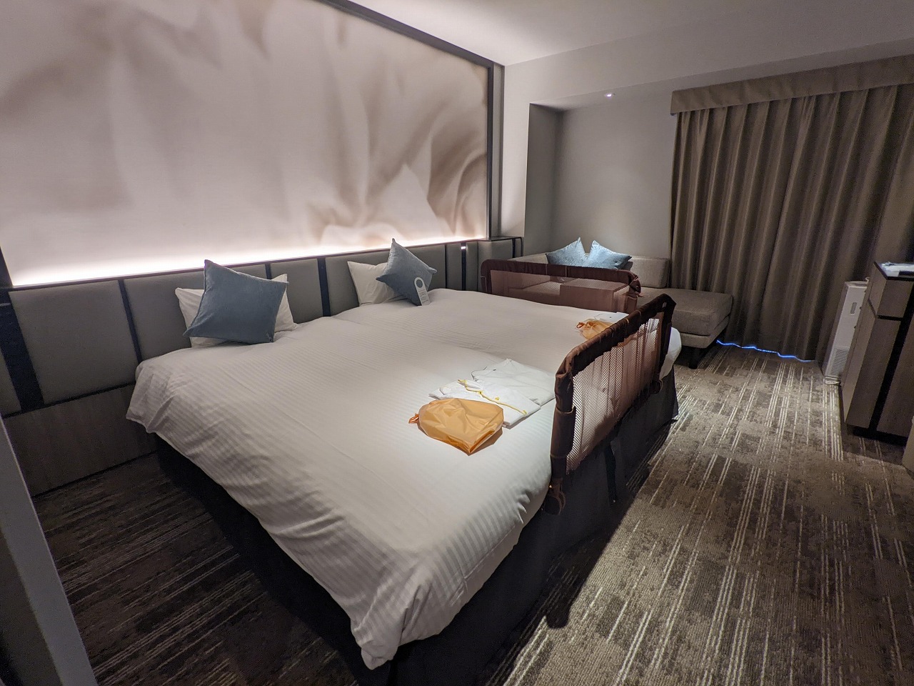 ツインベッドの横幅は85~140cmとホテルによりますが、標準サイズは110cm(経験上)。比較するとややコンパクト。大人2人・添い寝の子供2人の利用だと少~し窮屈感はありますが、気にし過ぎるほどではないと感じます。
