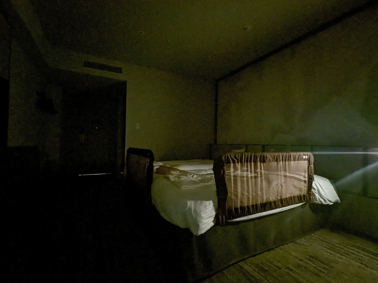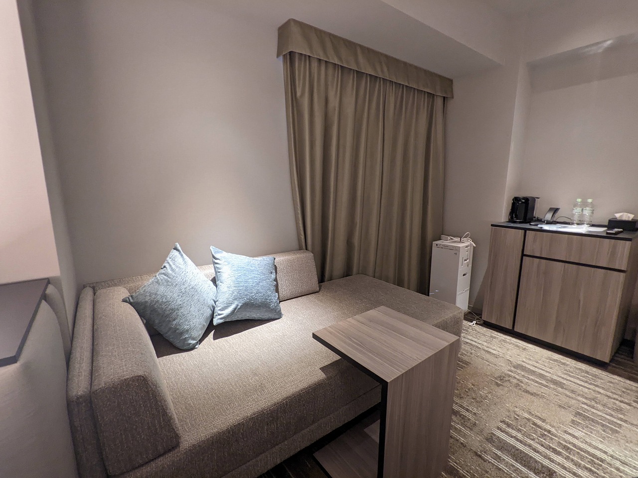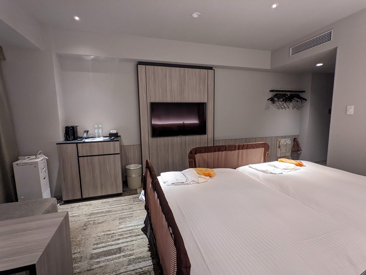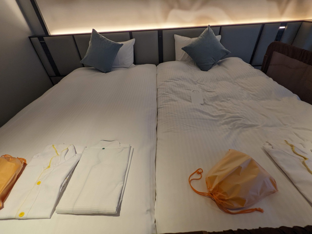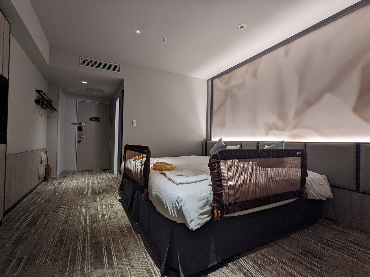 ツインベッドの横幅は85~140cmとホテルによりますが、標準サイズは110cm(経験上)。比較するとややコンパクト。大人2人・添い寝の子供2人の利用だと少~し窮屈感はありますが、気にし過ぎるほどではないと感じます。
