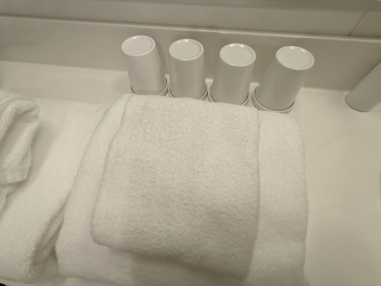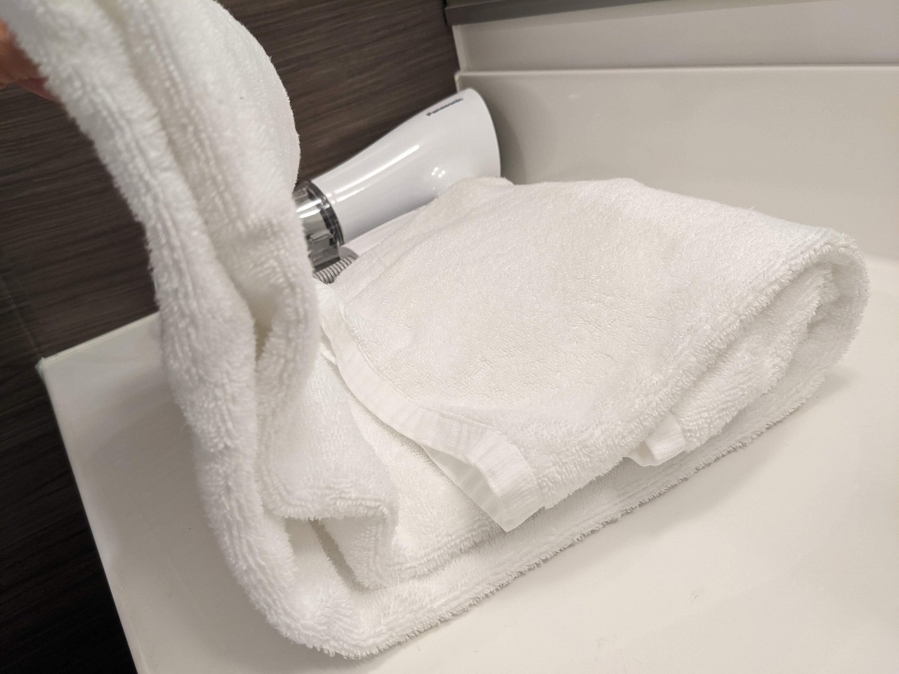 タオルはバスタオルとフェイスタオルの2種類。大きく分厚いバスタオルは、イメージ通りのホテルタオル。タオルは添い寝の子供を含め、追加可能です。