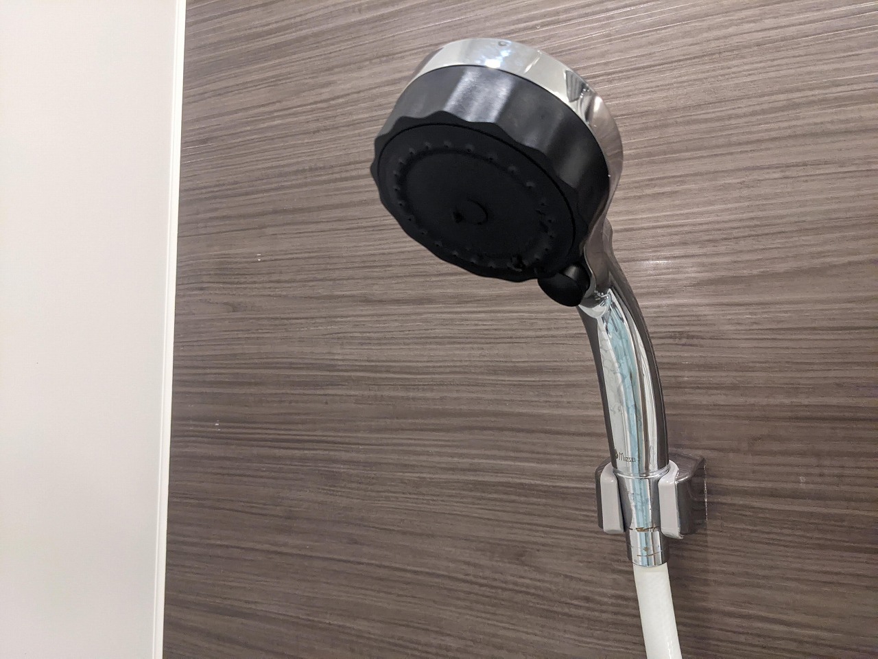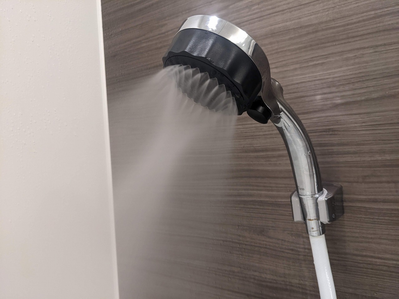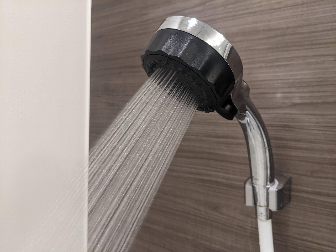 節水を感じるシャワーで、水圧は“弱い”というより“優しい”。モードは2段階切替できます。