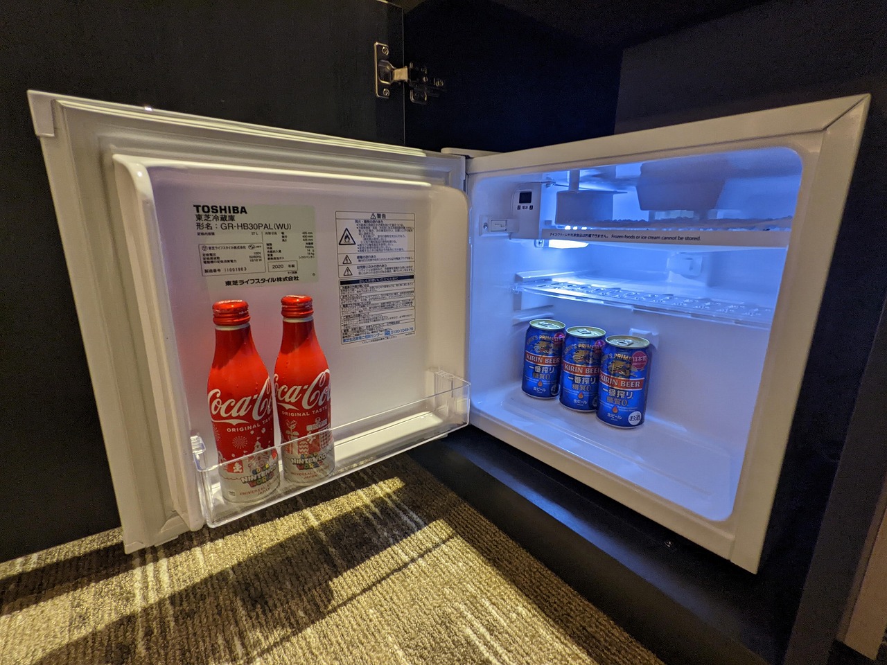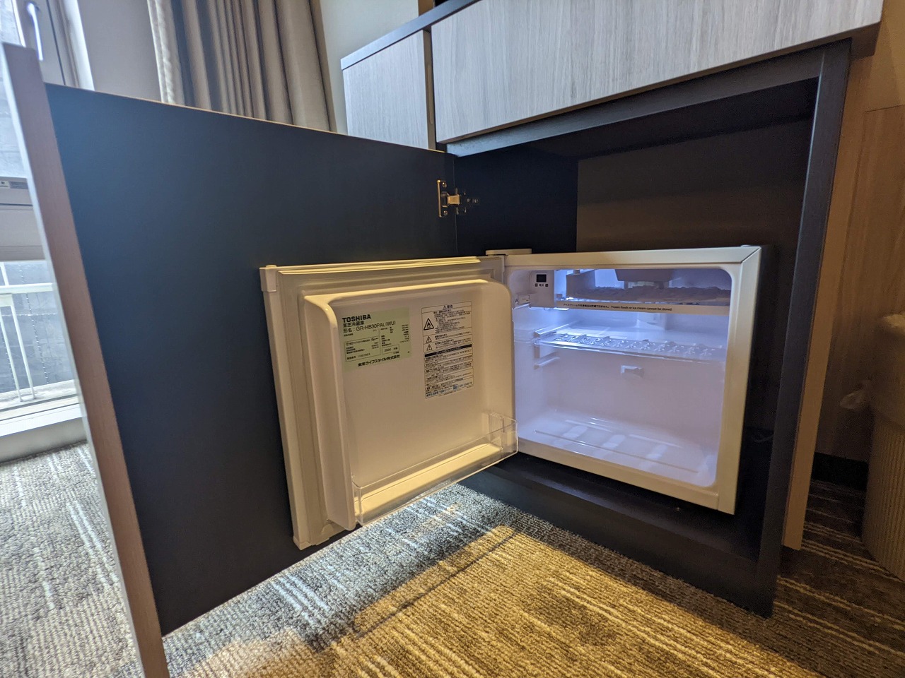 冷蔵庫の中はカラで、広々。電源ONのままだから、到着後すぐに冷やすことができます。