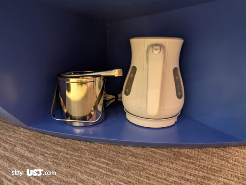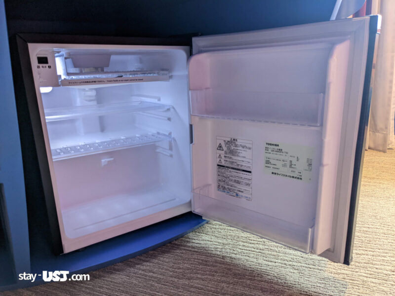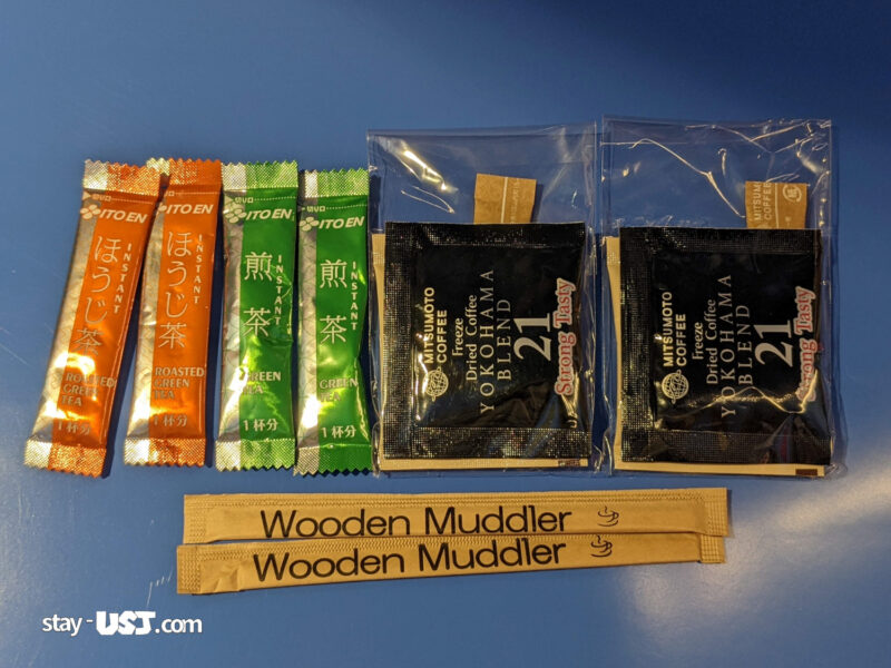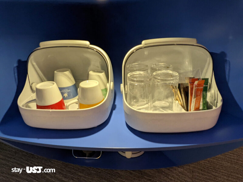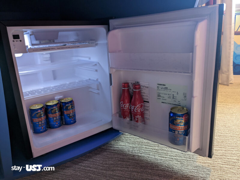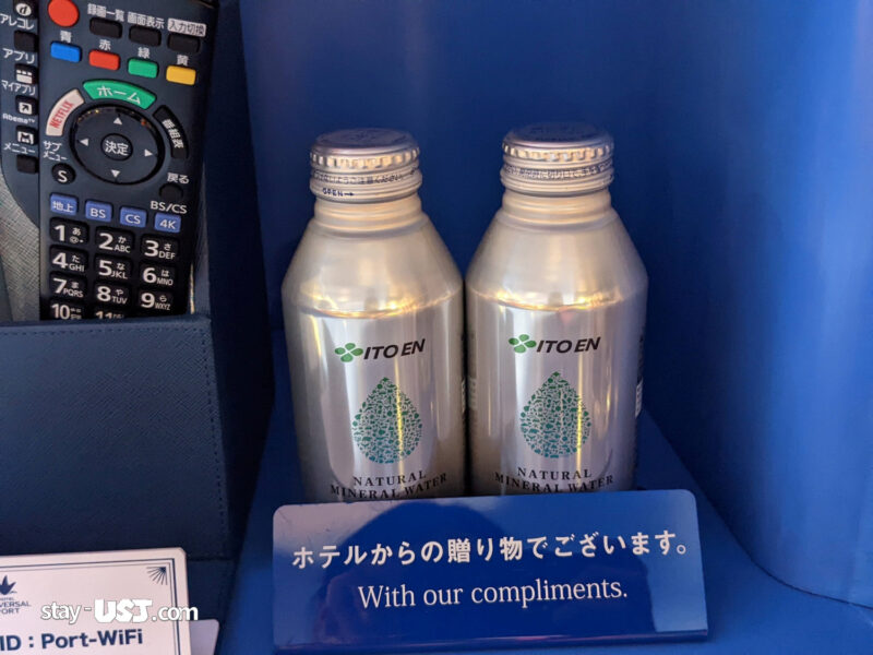 ドリンク類はホテルユニバーサルポート内の他の客室と同じ。サービスのお水がペットボトルじゃないのが違うくらいです。