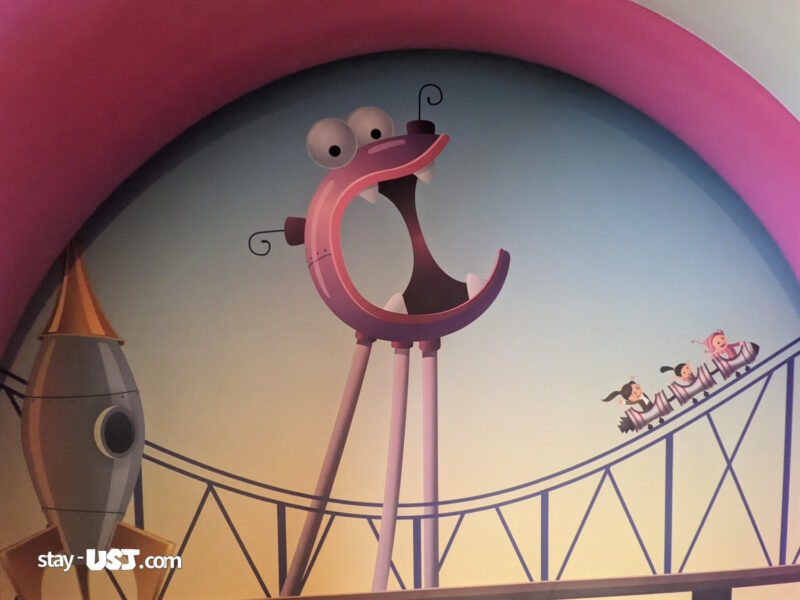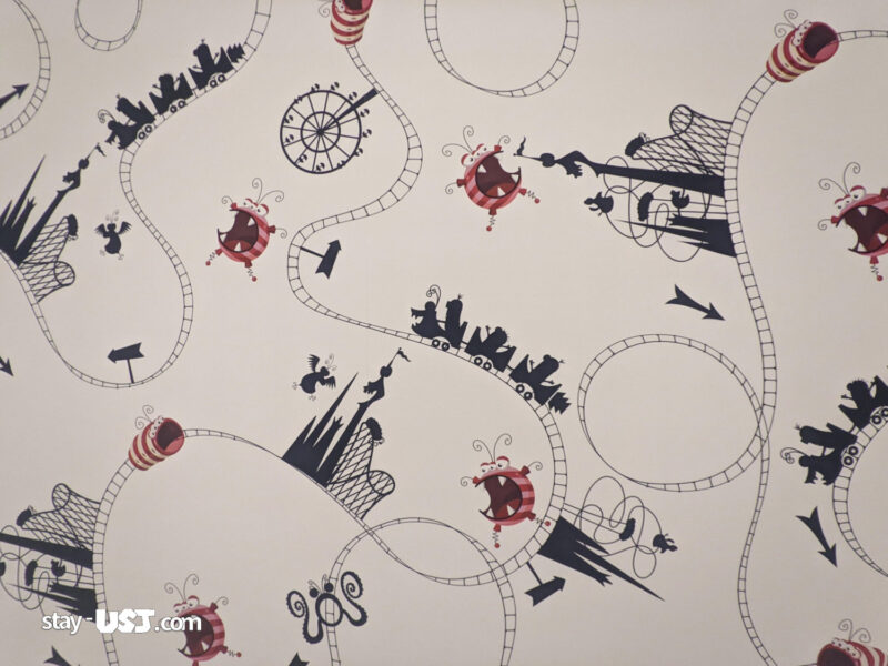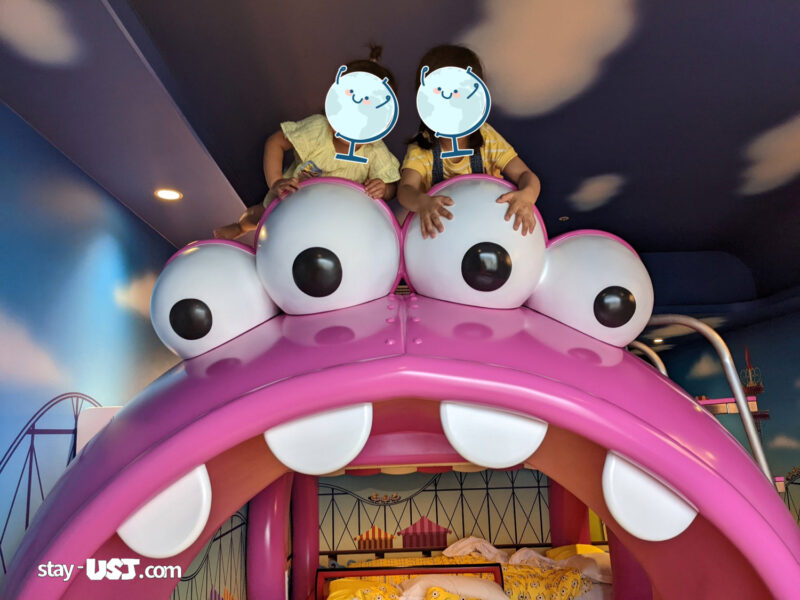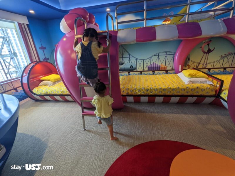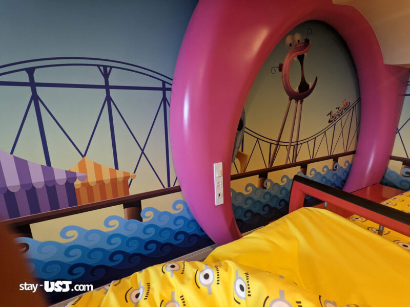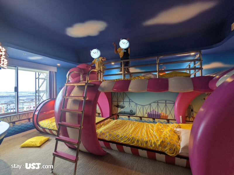 客室全体が映画「怪盗グルーの月泥棒」に登場する遊園地になっています。子連れはもちろん、利用者皆が楽しめる空間ですよ。ジェットコースターのベッドで眠る特別感をぜひ!